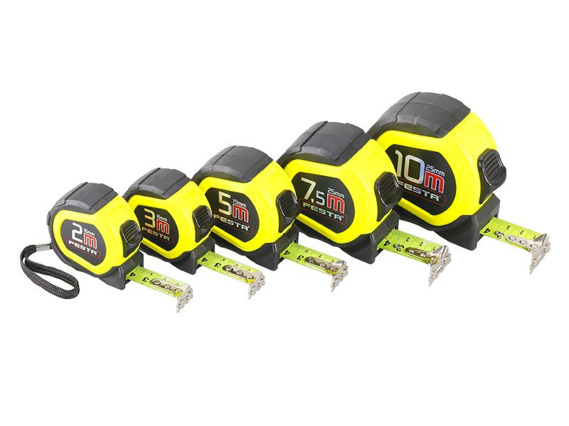 FESTA mágneses mérőszalag II. pontossági osztály, CE - tanúsítvány, kalibrálásra alkalmas mérő edzett szalag, fluoreszcens réteg - jó rossz fényviszonyok mellett is leolvasható skála, mágneses horog mérőtok ABS műanyagból gumi védelemmel - magasabb tartósság ütési sérülésekkel szemben, a mérő jobb kezelhetősége és tapadása hurok, övcsipesz