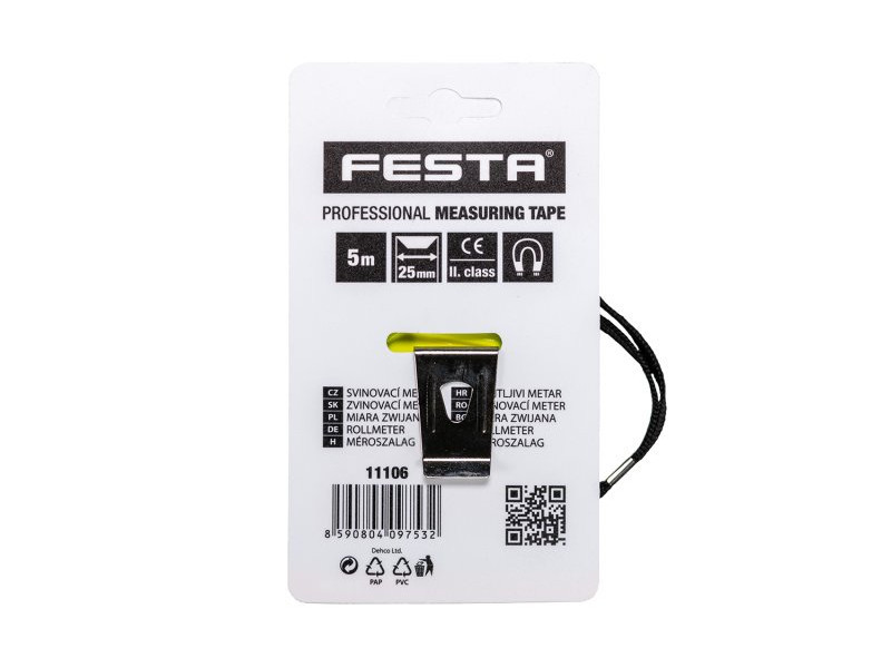 FESTA mágneses mérőszalag II. pontossági osztály, CE - tanúsítvány, kalibrálásra alkalmas mérő edzett szalag, fluoreszcens réteg - jó rossz fényviszonyok mellett is leolvasható skála, mágneses horog mérőtok ABS műanyagból gumi védelemmel - magasabb tartósság ütési sérülésekkel szemben, a mérő jobb kezelhetősége és tapadása hurok, övcsipesz