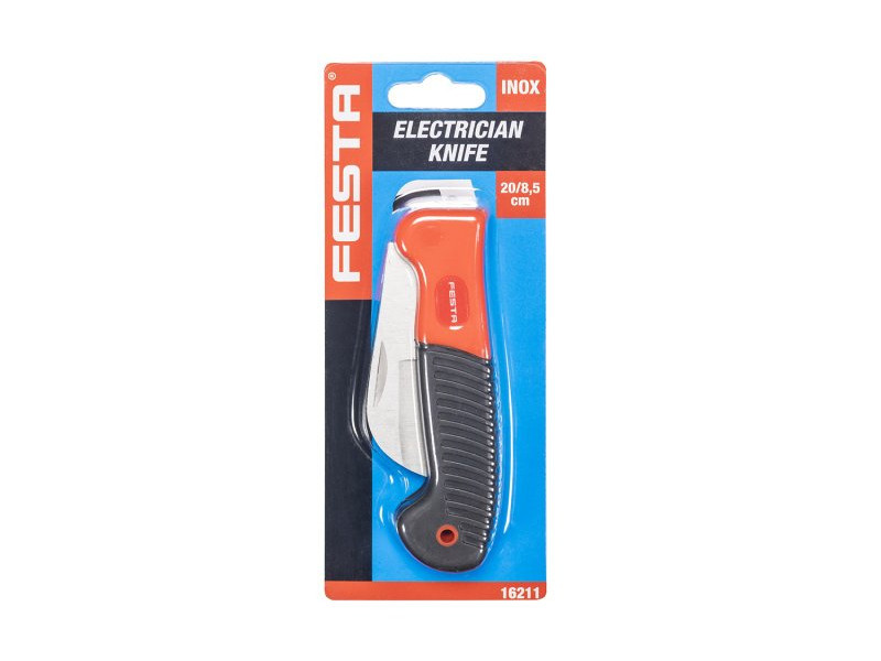 Záró villanyszerelő kés ívelt pengével, erős penge dupla éllel a vezetékek csupaszítását megkönnyítve, gumírozott ergonomikus nyél, buborékfólia.