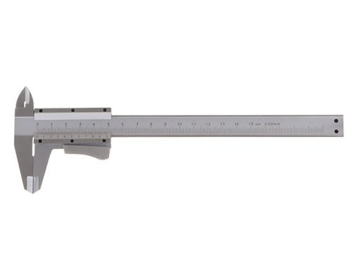 Tolómérő 0 - 150 mm 0,02 mm-es pontossággal, metrikus skála mm-ben, mélységmérő, kiváló minőségű rozsdamentes acél, precíz megmunkálás, gördülékeny mozgás, nyomógombos reteszelés, egységátalakító asztal, műanyag tok.