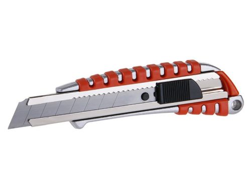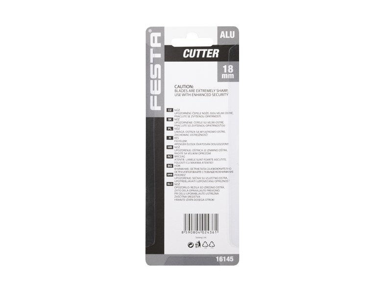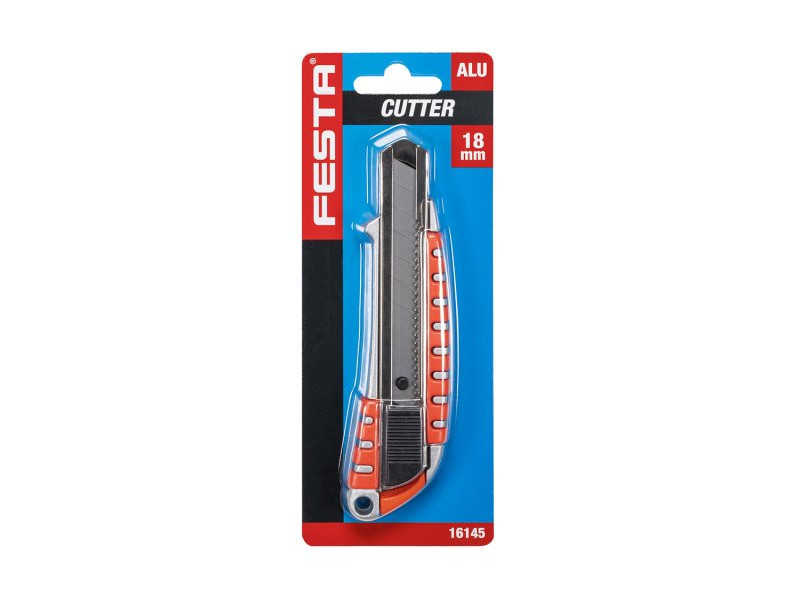 FESTA vágókés 18mm, minőségi anyagok, a kés teljesen fém teste, csúszásmentes műanyag kiemelkedések, fém rúd, automata tolózár, a késbe maximum 2 db tartalék penge helyezhető, buborékfólia.