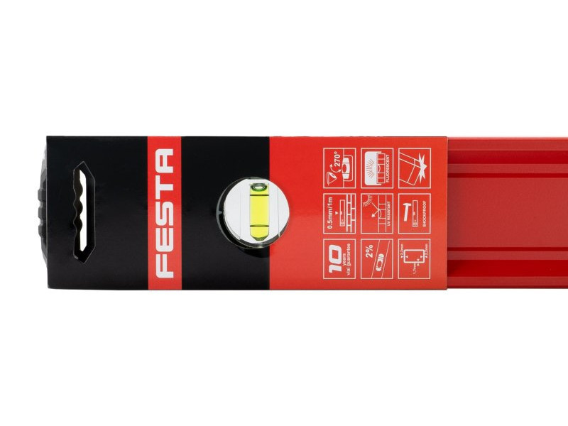 professzionális szintezési pontosság 0,5 mm / m - minden darab elektronikusan tesztelt profilozott és megerősített alumínuim profil falvastagság 2,2 mm, fekete üveg 3 akril libella, ütésálló -1 vízszintes hengeres* 1 és 2%-os ferde vonalakkal(+ a hengeres libella alakja a téglatesttel ellentétben kiváló láthatóságot biztosít minden szögből) függőleges 45° UV-stabil és fluoreszkáló folyadék a libellákban a jobb láthatóság érdekében a gumírozott, ütésálló végek nagyobb esésállósságot biztosítanak 2 praktikus markolat - a vízmérték jobb kezelése érdekében mérés közben10 év garancia a libellákra