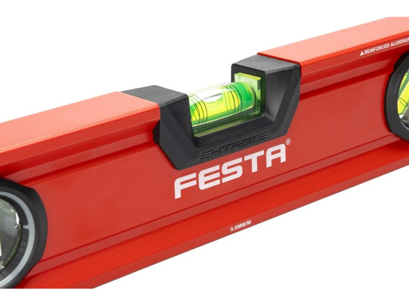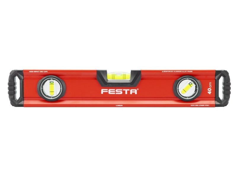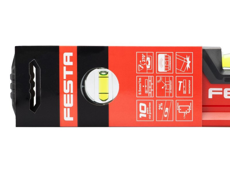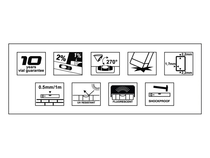 professzionális szintezési pontosság 0,5 mm / m - minden darab elektronikusan tesztelt profilozott és megerősített alumínuim profil falvastagság 2,2 mm, fekete üveg 3 akril libella, ütésálló -1 vízszintes hengeres* 1 és 2%-os ferde vonalakkal(+ a hengeres libella alakja a téglatesttel ellentétben kiváló láthatóságot biztosít minden szögből) függőleges 45° UV-stabil és fluoreszkáló folyadék a libellákban a jobb láthatóság érdekében a gumírozott, ütésálló végek nagyobb esésállósságot biztosítanak 2 praktikus markolat - a vízmérték jobb kezelése érdekében mérés közben10 év garancia a libellákra