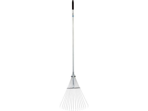 Könnyű kerti gereblye, rugalmas fémlemezből készült csíkokból. Könnyedén változtatható a szerszám szélessége a felhasználó igényei szerint. Fém nyéllel szerelt.
