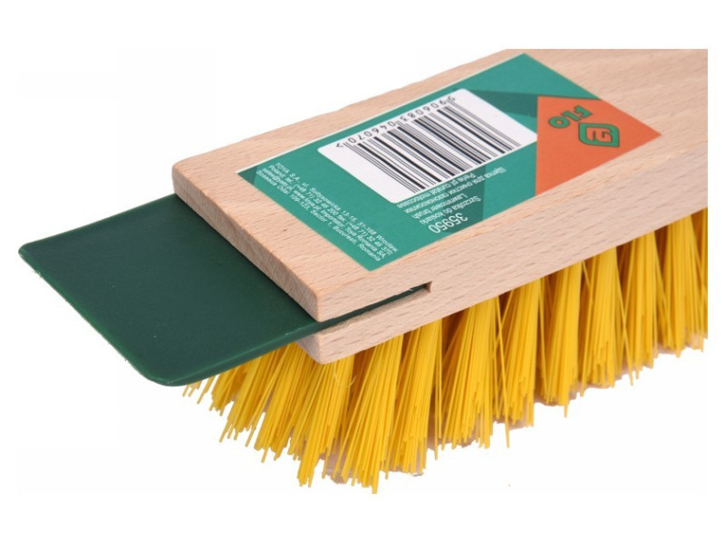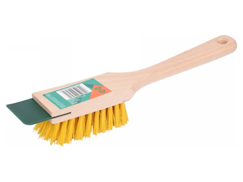 Praktikus kefe fűnyíró tisztításához kaparóval, hogy eltávolítsa a levágott fűt a házból.készült fából és magas minőségű műanyagbólsűrű és kemény sörtékkel rendelkezik