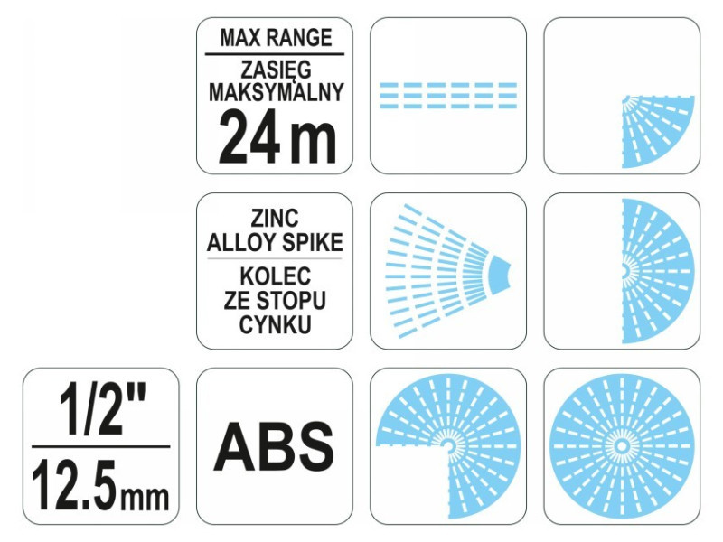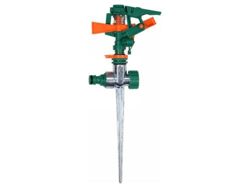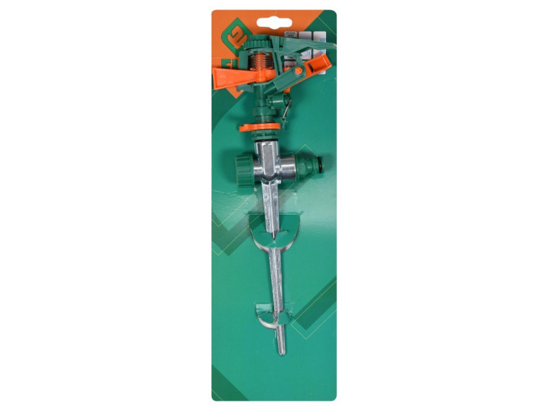 Forgó öntöző, impulzus öntöző ABS műanyagból. Cink ötvözet tüske teszi lehetővé a könnyű és kényelmes elhelyezést akár nagyon tömörült talajon is a gyepen. Maximális öntöző átmérő: 24 m állítható működési tartomány: 45-360° kényelmes gomb a permetezési távolság beállításához kapcsoló az öntözési tartomány szabályozásához ABS műanyagból készült galvanizált tűvel gyorscsatlakozóval (1/2", 12,5mm) és záró dugóval felszerelve.