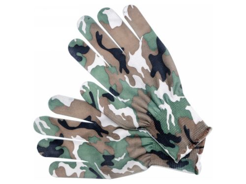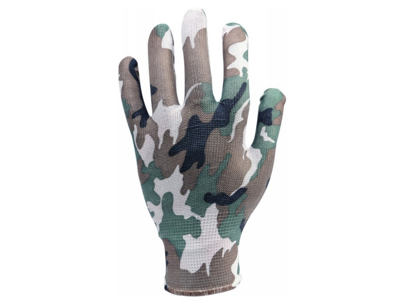 Könnyű kerti kesztyű poliészterből, moro színben. A varrat nélküli kialakítás nagy kényelmet és kiváló tapintást biztosít a fogott tárgynak. fogó rész: poliészter teteje: poliészter elasztikus mandzsetta . Használati figyelmeztetések: Csak minimális veszélyek esetén!
