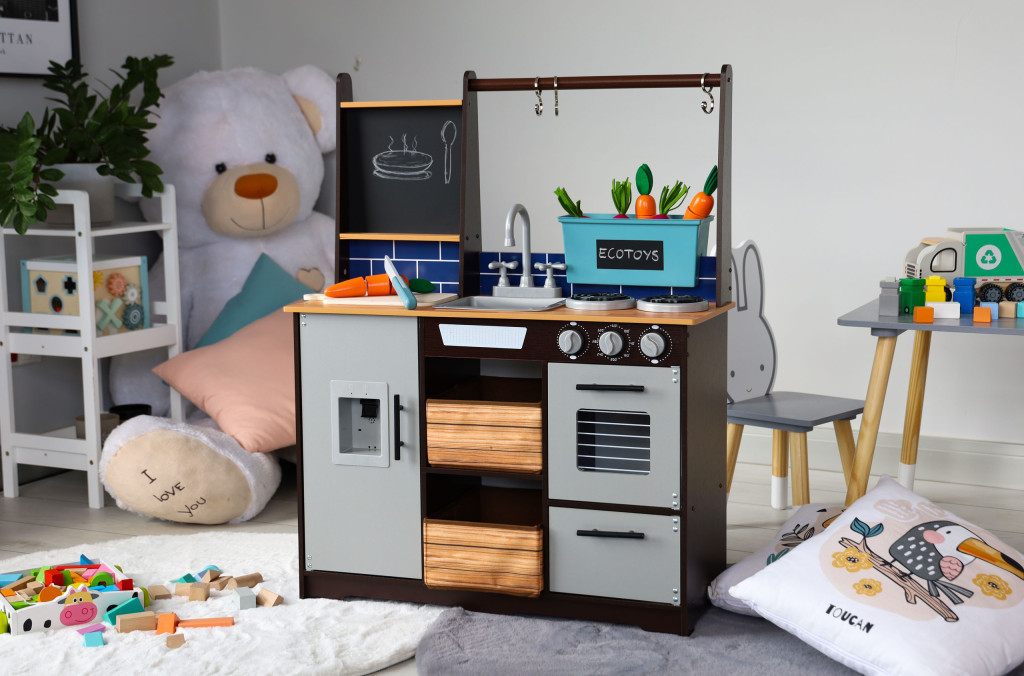 Fából készült konyha gyerekeknek veteményeskerttel és kiegészítőkkel