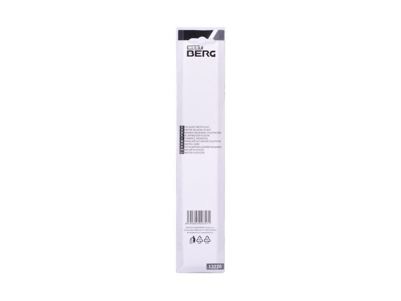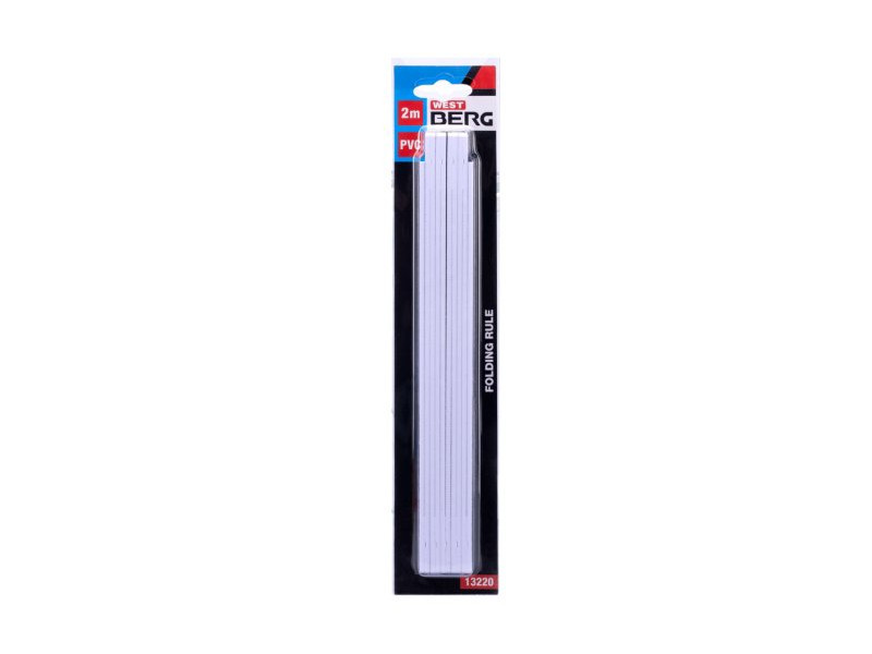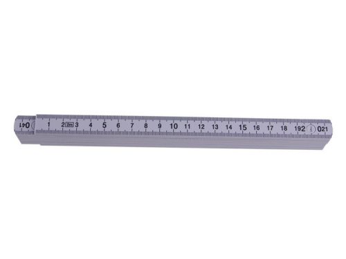 Műanyag összecsukható mérőszalag, fehér színű, kétoldalas skála mm-ben - jól leolvasható fekete nyomat, reteszelések az alkatrész 90°-os rögzítési lehetőségével.