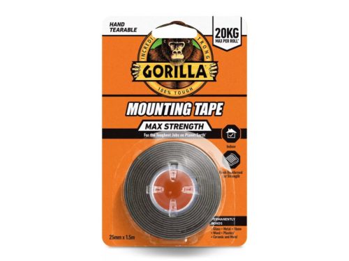 A Gorilla Mounting Tape Max Strength a márka legerősebb beltéri kétoldalas ragasztószalagja. Hálóerősített szerkezetének és nagy sűrűségű ragasztórétegének köszönhetően akár 20 kg súlyt is elbír egy tekercs, ha függőlegesen, megfelelően alkalmazzák (7 cm szalag = 1 kg teher).