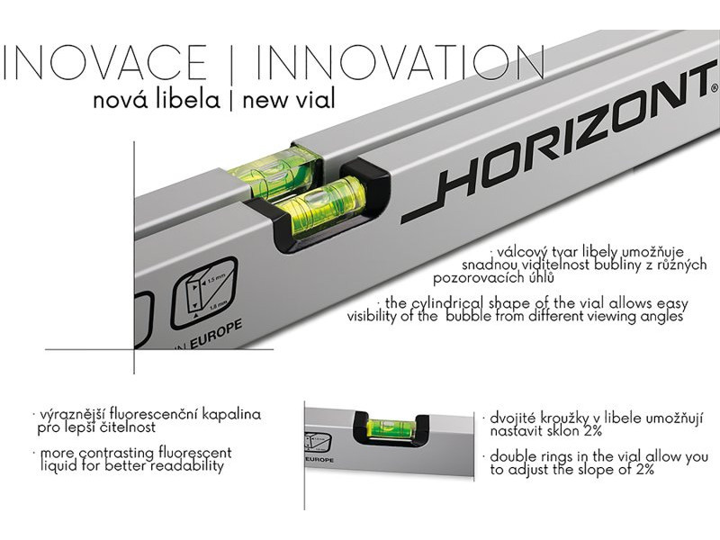 újított vízszintes hengeres szint – minden szögből könnyen látható kettős gyűrűk vízmértékben - külső gyűrűk 2%-os lejtőhöz kifejezettebb fluoreszkáló folyadék a buborék jobb láthatósága érdekében a napon és rossz fényviszonyok között vízmérték két fiolával pontosság 0,5 mm/m = 0,0285° ALU profil falvastagság 1,5 mm, eloxált kopásálló felület a vízmérték ellenáll a működési hatásoknak10 év garancia a vízmértékekre, MINDEN DARAB ELEKTRONIKUSAN TESZTELVE