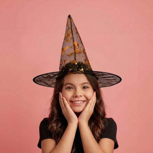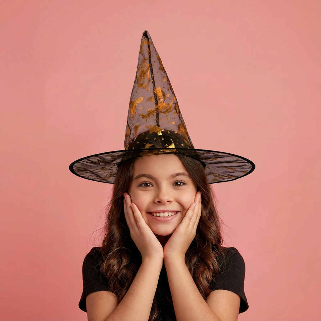 Hegyes, 4 színben kapható boszorkánykalap, amely kiváló halloween-i jelmez kiegészítő. A kalap külső részén aranyszínű, csillogós halloween-i motívumok találhatóak.