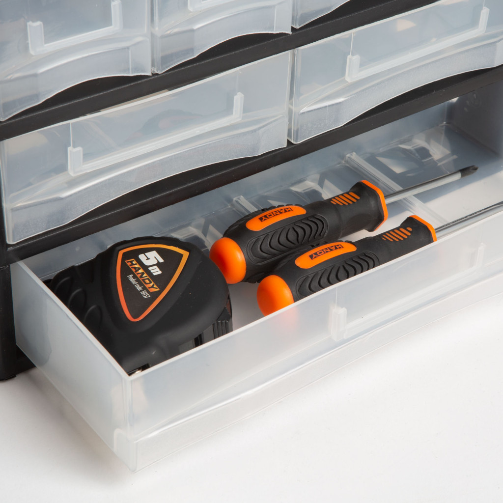 Hatékony munkát csak rendezett körülmények között végezhet! A munka során szükséges apró alkatrészeket, csavarokat, tiplit, szeget, kapcsolókat vagy egyéb elektronikai alkatrészeket, méret és típus szerint elkülönítve tarthat, ennek a hordozható rendszerezőnek a segítségével. Az elválasztóelemeknek köszönhetően, akár 24 féle kelléket is elkülöníthet egymástól. Az áttetsző és kivehető fiókok jó áttekinthetőséget biztosítanak.