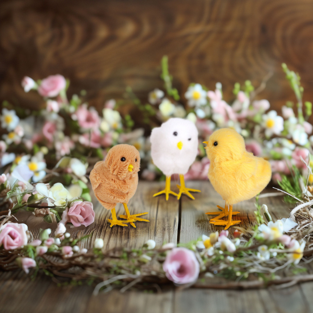 Ezek a bájos húsvéti csibék tökéletes kiegészítői lehetnek bármely ünnepi dekorációnak. A három különböző színű csibe – fehér, sárga és barna – élethű kialakítása és puha borítása vidám tavaszi hangulatot teremt. Akár asztaldíszként, akár kosarakba vagy ajándékcsomagokba helyezve dekorációként is remek választás. A csibék könnyűek, mégis stabilan állnak, így bárhová elhelyezhetőek. Ideálisak otthoni vagy irodai dekorációhoz, valamint kreatív húsvéti kompozíciókhoz. A minőségi anyaghasználatnak köszönhetően hosszú távon is megőrzik szépségüket.