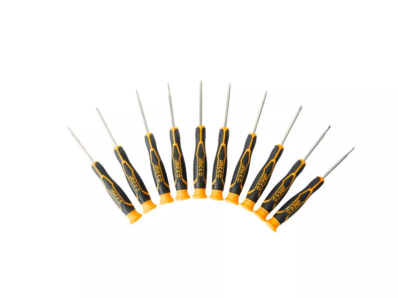 10 db precíziós csavarhúzó: SL1.5 x 50, Sl2 x 50 mm, SL2.5 x 50, Sl3 x 50 mm, PH000 x 50, PH00 x 50 mm, PH0 x 50 mm, T6 x 50, T8 x 50, T10 x 50 mm