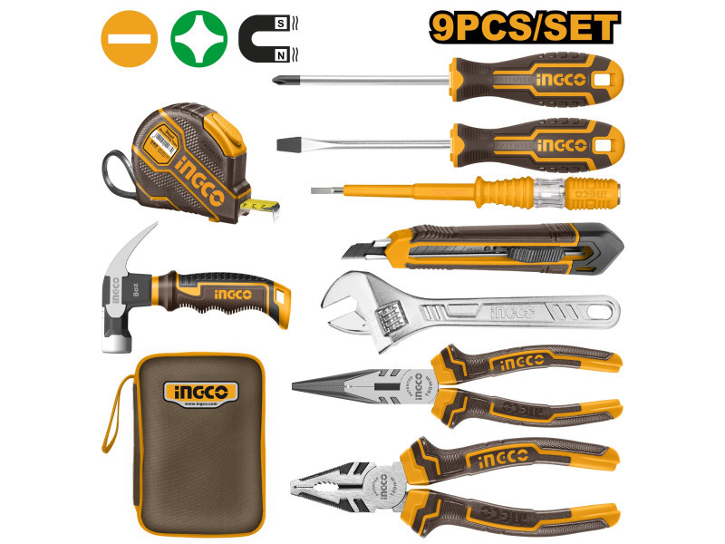 Egy klasszikus, 9 darabos kéziszerszám-készlet, amely otthoni dekorációhoz, játékjavításhoz stb. alkalmas.A csavarhúzó, a mini kalapács és a fogó nyelét a TOTAL egyedi tervezésével alakították ki, amely csúszásmentesebb és kopásállóbb, és jobban összhangban van az ergonómiával.A csavarhúzó szára Kínában a legjobb acélgyárból származó, kiváló minőségű CrV acélból készült, és egészében hőkezelt, nagyobb keménységgel és nyomatékkal. A fej mágneses, miatt képes kis csavarokat stb. felszívni, így használata kényelmesebb; a mini kalapács 45# magas szénacélból kovácsolt kalapácsfejjel rendelkezik, amely erős és tartós. A hosszú csőrű fogó egészében hőkezelt, nagy szilárdságú és hosszú élettartamú, a pengéje pedig magas frekvenciájú hőkezeléssel készült, ami megkönnyíti a vágást.A szerszámok szövetzsákban vannak csomagolva, a szerszámok elrendezése logikus, a forma szép, és könnyen hordozható.A készlet tartalma::Acél mérőszalag: 3 m x 16 mmPhillips csavarhúzó: PH1 x 100 mmLapos csavarhúzó: SL5.5 x 100 mmÁllítható kulcs: 200 mm (8")Hosszúcsőrű fogó: 150 mm (6")Kombinált fogó: 180 mm (7")Törhető pengés kés 18 mmFázisceruza: 190 mmMini ácskalapács: 230 g (8oz)
