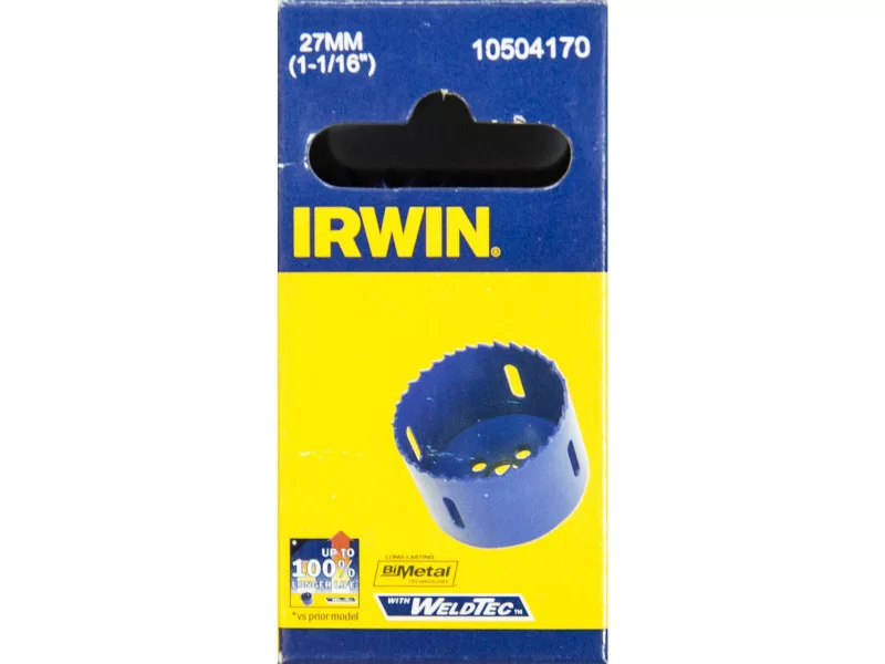 Az IRWIN® bimetál körkivágók különféle anyagokat vágnak át, beleértve: alumíniumot, rezet, vasat, rozsdamentes acélt, fát és cinket. Az elektronsugárral hegesztett nagysebességű acél (HSS) vágóél erősebb, tartósabb fogakat biztosít. A precízen beállított fogak gyorsabb behatolást és vágást biztosítanak. A bimetál szerkezet pedig szívósságot és hosszú élettartamot biztosít. WELDTEC™ TECHNOLÓGIA Nagyobb tartósságot és nagyobb vágási sebességet biztosít FOG KIALAKÍTÁSA Akár 100%-kal hosszabb élettartam és 50%-kal gyorsabb vágás 4,5 / 5,5 VÁLTOZÓ TPI A gyorsabb vágás, a kisebb nyomaték felhalmozódás és a jobb forgácseltávolítás érdekében VASTAG HÁTLAP Strapabírást biztosít a legnehezebb munkákhoz is BIMETÁL KONSTRUKCIÓ A megnövelt élettartam és tartósság érdekében