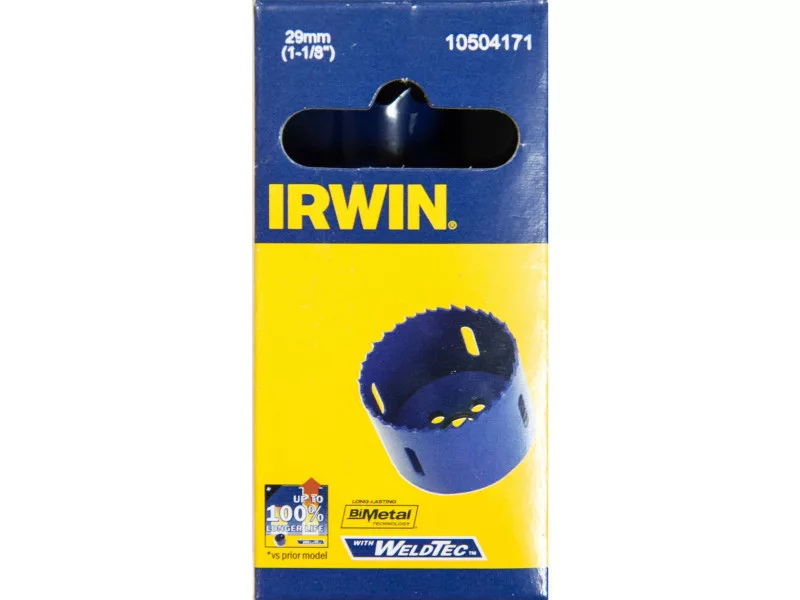 Az IRWIN® bimetál körkivágók különféle anyagokat vágnak át, beleértve: alumíniumot, rezet, vasat, rozsdamentes acélt, fát és cinket. Az elektronsugárral hegesztett nagysebességű acél (HSS) vágóél erősebb, tartósabb fogakat biztosít. A precízen beállított fogak gyorsabb behatolást és vágást biztosítanak. A bimetál szerkezet pedig szívósságot és hosszú élettartamot biztosít. WELDTEC™ TECHNOLÓGIA Nagyobb tartósságot és nagyobb vágási sebességet biztosít FOG KIALAKÍTÁSA Akár 100%-kal hosszabb élettartam és 50%-kal gyorsabb vágás 4,5 / 5,5 VÁLTOZÓ TPI A gyorsabb vágás, a kisebb nyomaték felhalmozódás és a jobb forgácseltávolítás érdekében VASTAG HÁTLAP Strapabírást biztosít a legnehezebb munkákhoz is BIMETÁL KONSTRUKCIÓ A megnövelt élettartam és tartósság érdekében