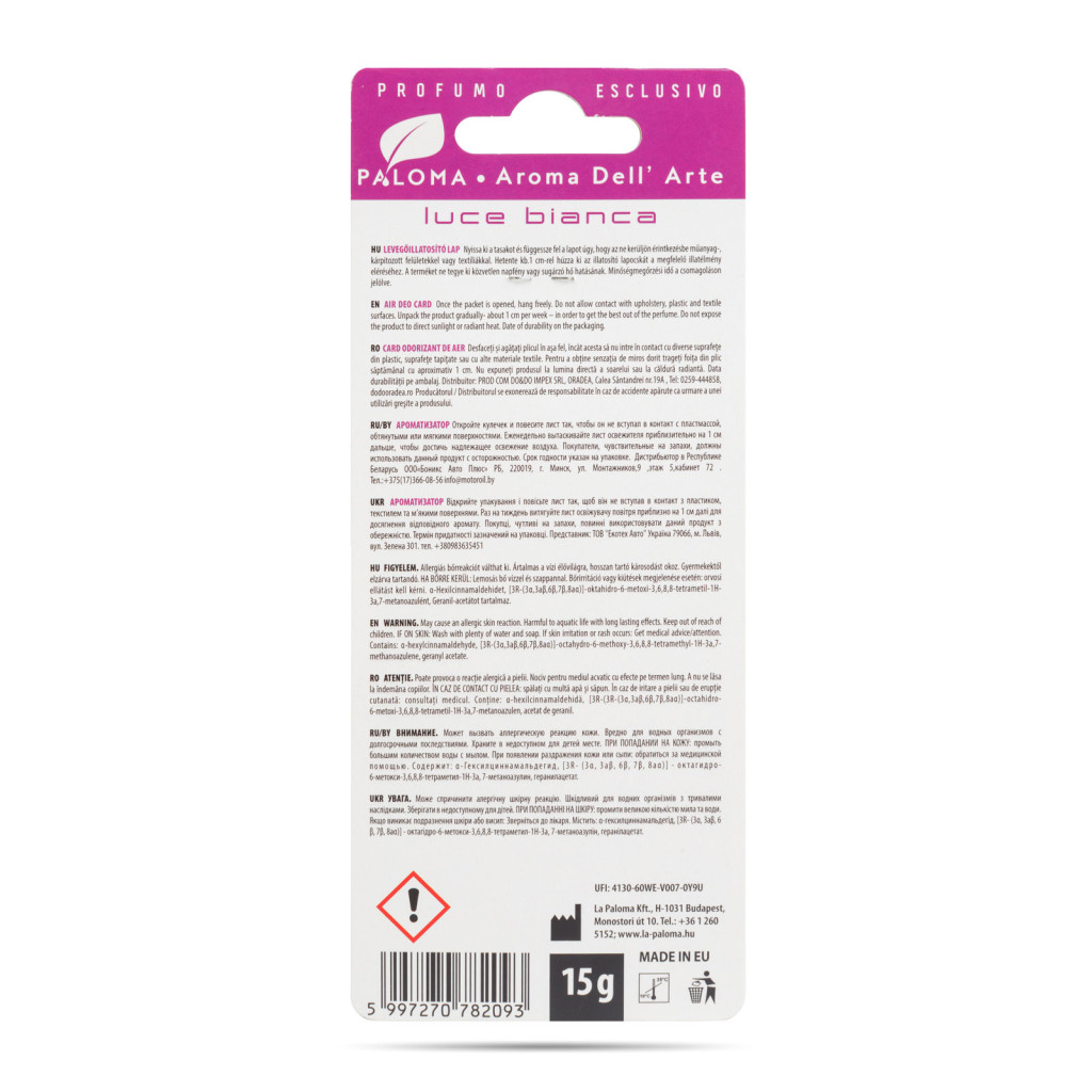 A Paloma Aroma Del 'Arte illatosító család eleganciájával és kifinomultságával minden utazást különlegessé varázsol! A modern dizájn és a letisztult színvilág egyaránt kifinomult és stílusos megjelenést biztosít autójában. Az illatosító kellemes, friss illatával frissességet és tisztaságot hoz a jármű belső terébe. Ideális választás mindazok számára, akik nemcsak az illatra, hanem az autójuk belső terének harmóniájára is nagy hangsúlyt fektetnek.