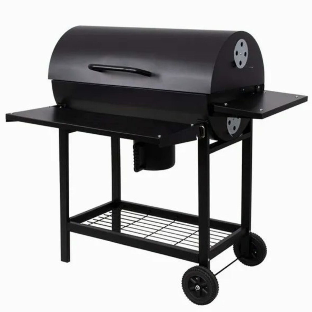 Alkalmas kertek fedett területeire. Robusztus fém konstrukció, fekete hőálló felület, rakodófelület, kerekek, hamutartó