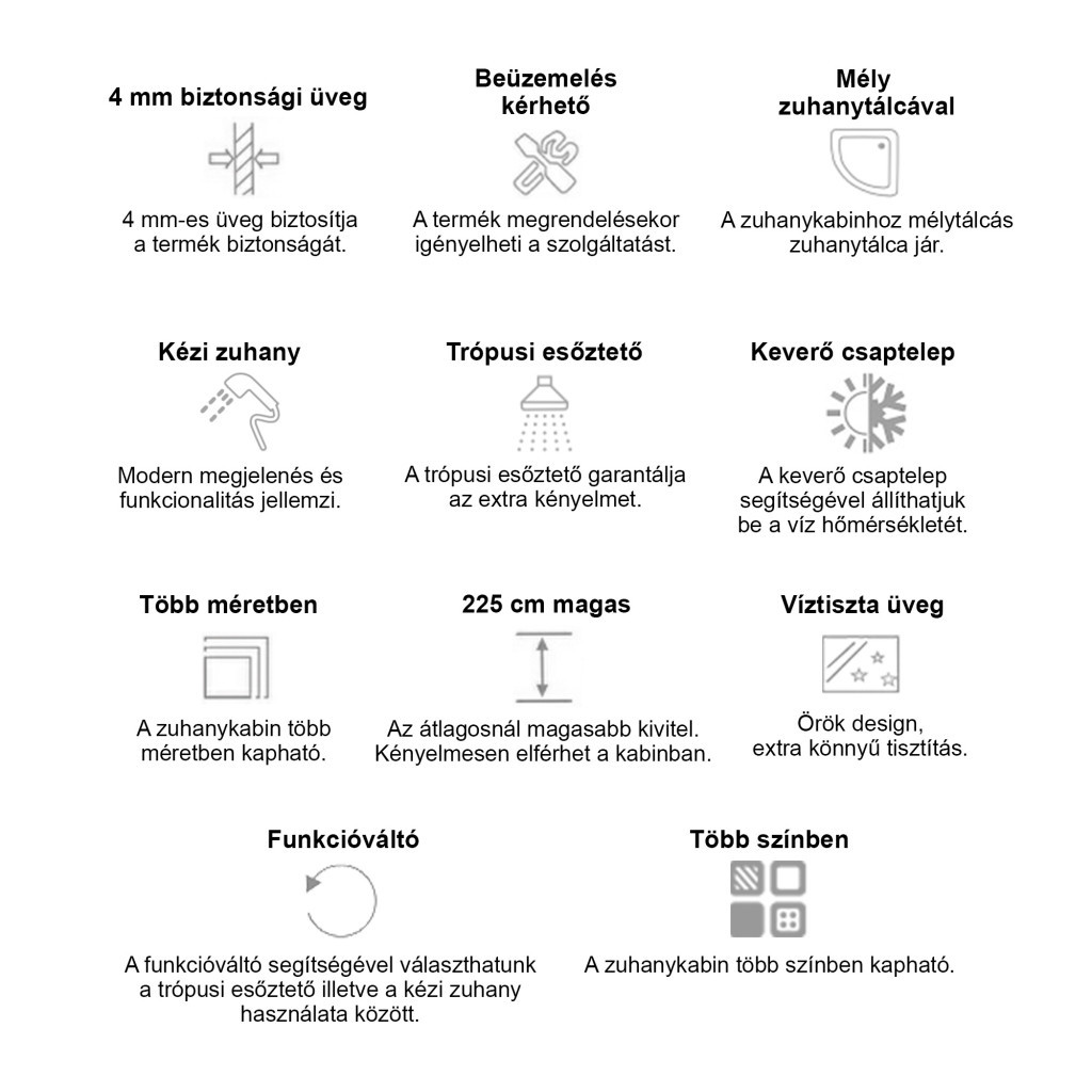 • Felszereltség: Trópusi esőztető, kézi zuhany, keverő csaptelep, funkcióváltó, mágneses ajtózár, beépített ülőke
