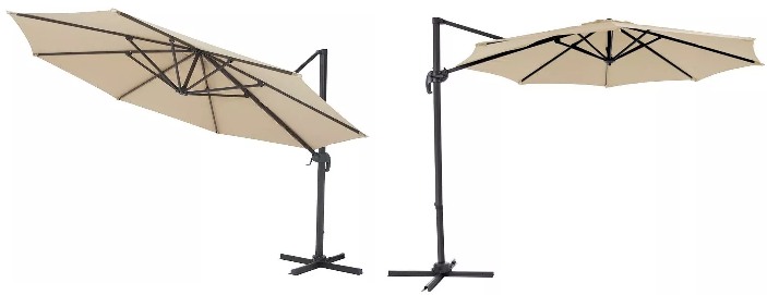 Az árnyékoló a szerkezet oldalán helyezkedik el, amely lehetővé teszi az árnyékolt tér 100% -os kihasználását. A napernyő lehetővé teszi, hogy árnyékos helyet hozzon létre a kikapcsolódásra, a közös étkezésre vagy a szeretteivel való találkozásra. A kerti felszerelések alapvető elemei a kerti napernyők. Kiváló védelmet nyújtanak mind a napsugárzás, mind a nyári eső ellen. A megnövekedett átmérő miatt további súlyt kell helyezni az alapra.