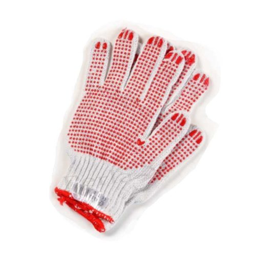 Pamut/poliészter anyagú cérnakesztyű, tenyér részén  PVC pöttyözéssel, mely garantálja a csúszásbiztos fogást.