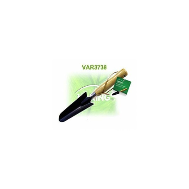 Kis kerti ültető lapát. Korrózió elleni bevonattal kezelt acél fejjel. Lakozott fa nyéllel.