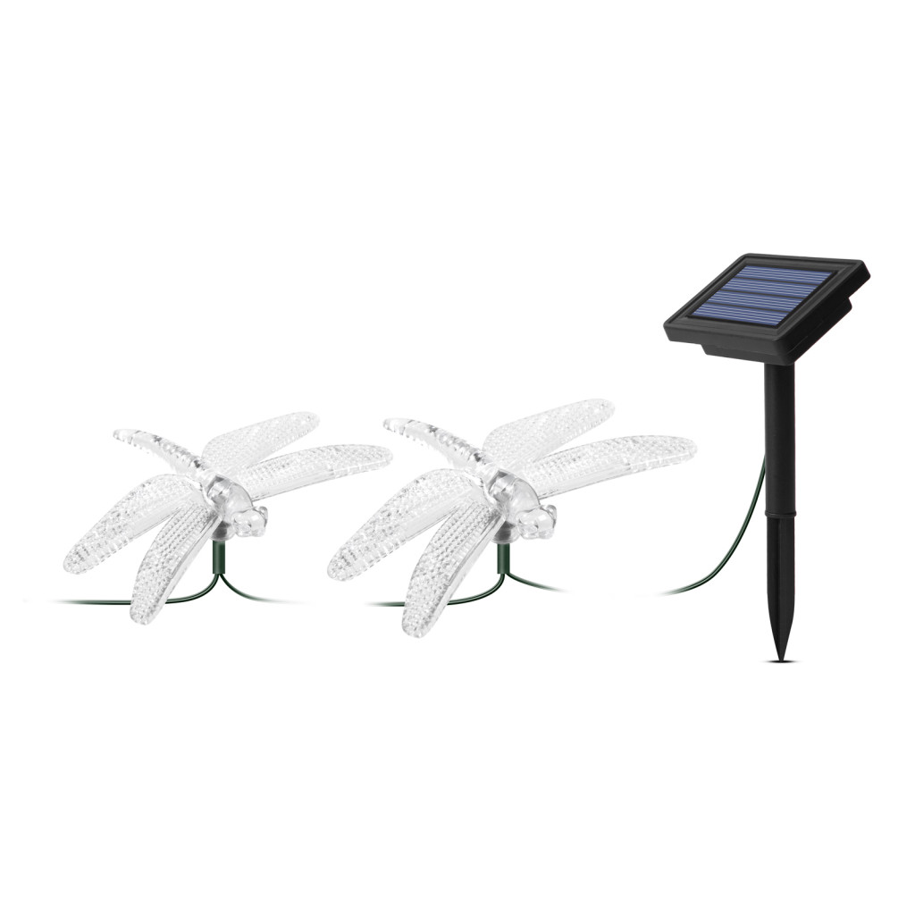 10 db akril szitakötőből álló napelemes lámpa szett, amely varázslatos hangulatot teremt bármely kertben. Az átlátszó kis rovarok piros, sárga, kék, zöld LED-ek világítják meg, ezzel teremtve kellemes hangulatot hazaérkezéskor. A nap folyamán a szolár panel a napfényt elektromos árammá alakítja és feltölti a beépített akkumulátort. Szürkületkor a termék automatikusan bekapcsol, napfelkeltekor pedig ki. Ideális lehet bármilyen kertben, bokrok, fák, virágoskertek egyedi és különleges dekorálására.