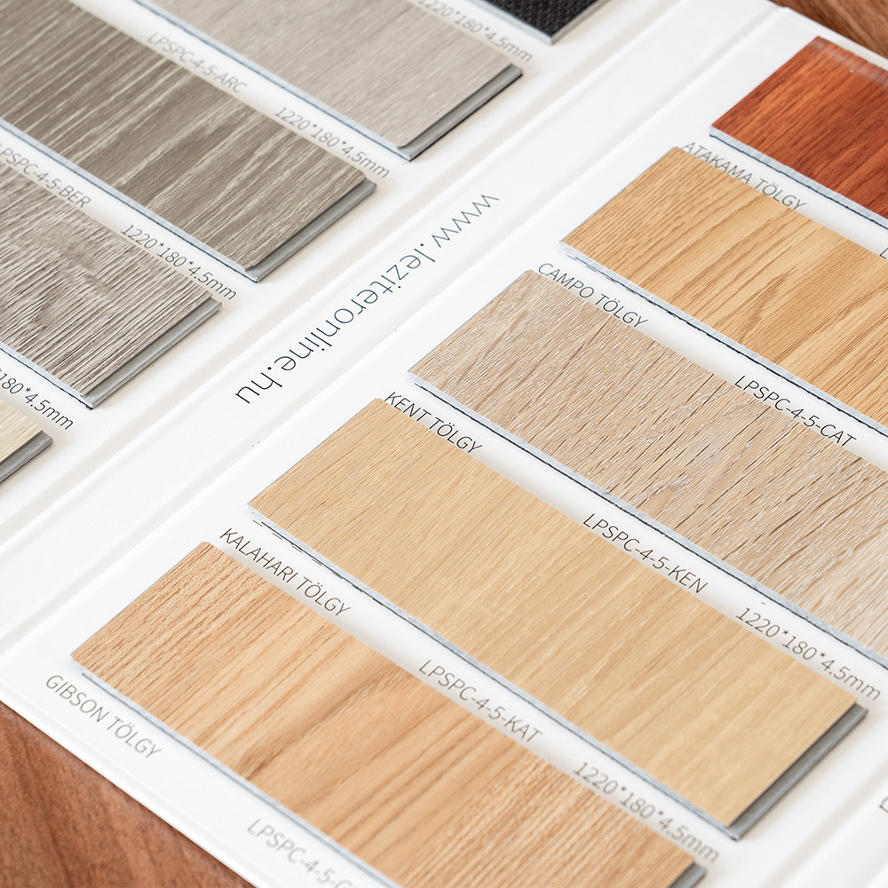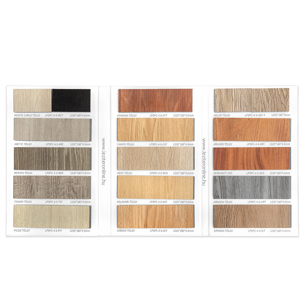 Az SPC padló egyik legnagyobb előnye a strukturált felület és a részletgazdag faerezet. A mintakönyvben nemcsak látod, hanem meg is tapinthatod a felületet, így pontos képet kapsz a minőségről, a fózolt élekről és az anyag karakteréről.