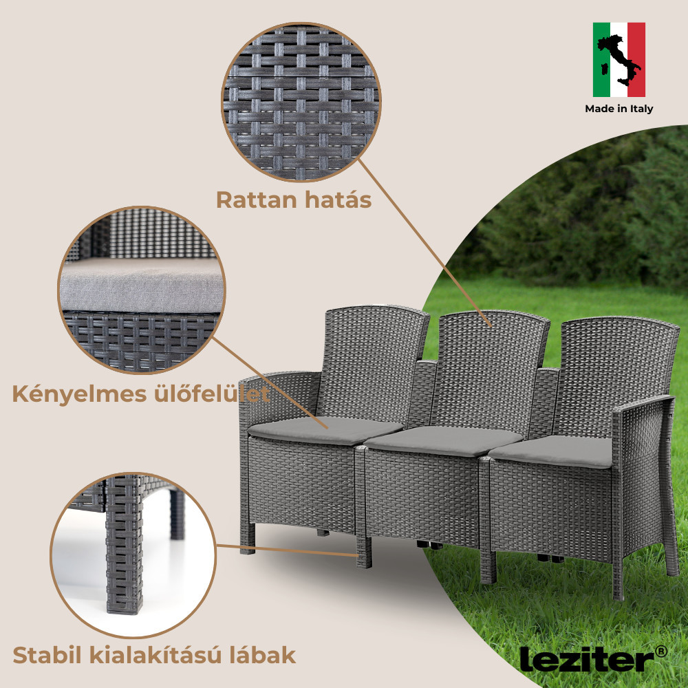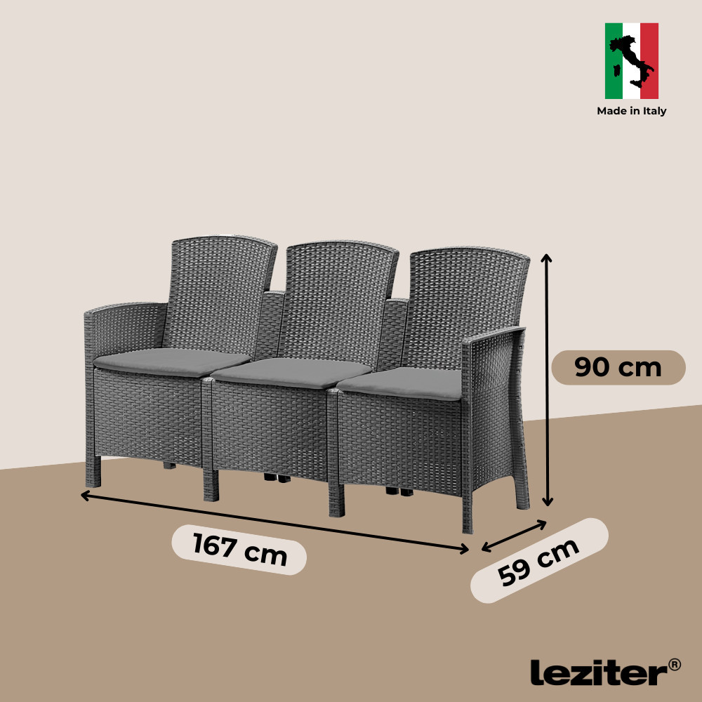 A grafit szín és az eredeti rattan hatású textúra miatt ez a kanapé könnyedén illeszkedik modern és klasszikus stílusú kertekbe, teraszokra vagy akár éttermi területekre is. Kompakt mérete (167 x 59 x 90 cm) lehetővé teszi, hogy kisebb teraszokon is jól mutasson, miközben elegendő helyet biztosít a kényelmes ücsörgéshez.