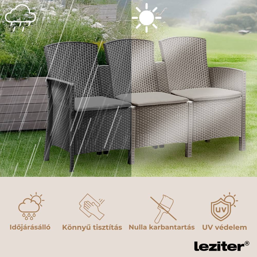 Egy kerti bútortól elvárás, hogy hosszú évekig szép és kényelmes maradjon. A Lima kanapé a műrattan előnyeit egyesíti az elegáns, letisztult megjelenéssel. UV- és időjárásálló anyagának köszönhetően nem kell aggódni sem az eső, sem a tűző nap miatt. A könnyen tisztítható, strapabíró felület pedig lehetővé teszi, hogy évekig élvezd a kényelmét anélkül, hogy karbantartásra lenne szükség.
