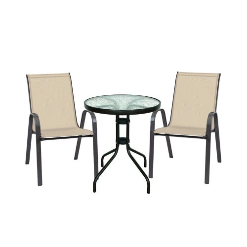 A modern kivitelű kerti bútorkészlet egy kerti üveglapos asztalt és 2 karfás széket tartalmaz. A bútorokat 2 fő számára tervezték. A székek teherbírása összesen maximum 120 kg. A székek és az asztal lábazata fémből készül. Az asztallap 5 mm-es edzett üvegből készült, amely ellenáll a kisebb karcolásoknak. Az textilén szék ülésanyaga ellenáll az időjárási viszonyoknak. Előnye az ergonómikusan profilált ülés és karfa, amelyek tehermentesítik a vállakat pihenés közben.