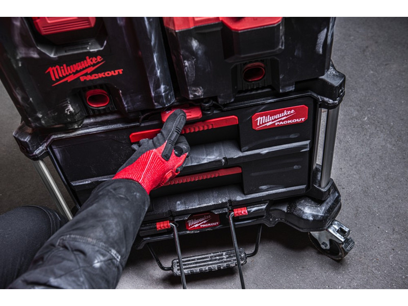 • A PACKOUT™ fiókos tárolóláda lehetővé teszi a szerszámokhoz való könnyű hozzáférést, még akkor is, ha a PACKOUT™ tárolók aljára kerül.
