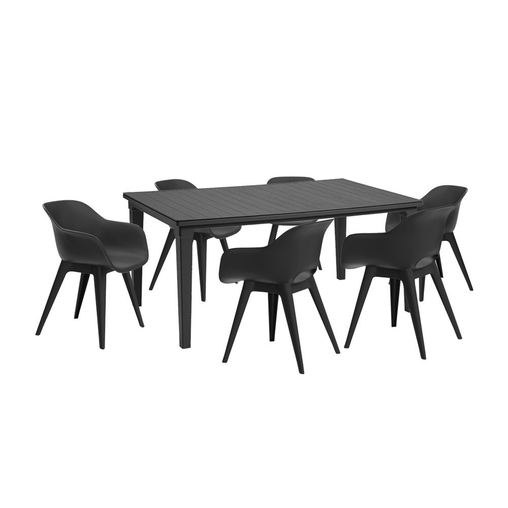 Ez a grafit színű, kényelmes és elegáns bútor szett hat darab 57X56X81 cm-es széket, és egy 165X95X75 cm-es asztalt foglal magában. Ez a 6 személyes kerti bútor szett rendkívül előnyös lehet, ha szeretnéd kiélvezni a szabadban eltöltött időt barátaiddal vagy családoddal. Ideális elemként szolgál a kert, erkély vagy terasz díszítéséhez. Különleges formája és minimalista megjelenése teszi univerzálissá és bármilyen elrendezéshez alkalmazkodik. A szett praktikus megoldás, egész évben a szabadban maradhat, hisz magas a tűröképessége és ellenáll a szélsőséges időjárásoknak.