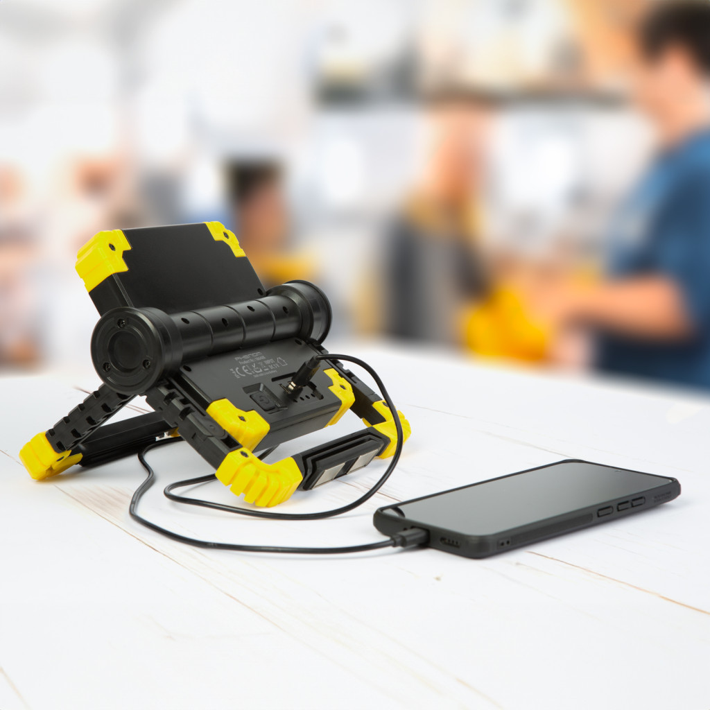 Phenom termékcsalád minőségi új reflektora, amely nélkülözhetetlen kelléke lehet műhelyeknek, építkezéseknek vagy akár háztartásának. A nagy teljesítményű 2 x 10 W-os COB LED-ek ~2 x 1000 Lumen fényerővel 5-6 órán keresztül világítja be a teret.A beépített 5V-os Type-C USB port megfelelő tápellátást biztosít például mobiltelefonja feltöltéséhez. A forgatható fejnek köszönhetően maximalizálhatja a szükséges terület bevilágítását.