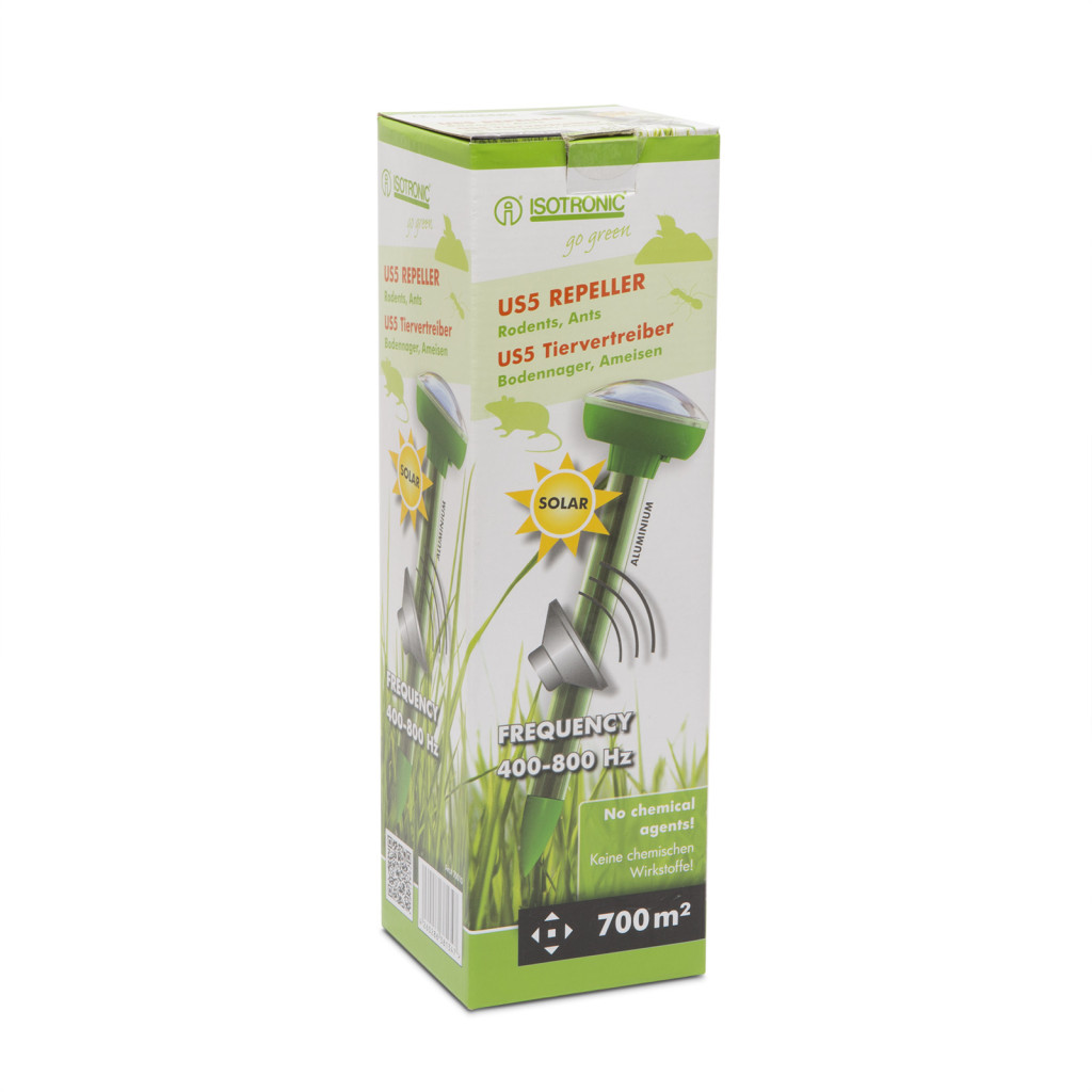Az innovatív Napelemes hangya-, vakond-, egérriasztó az Isotronic kiváló terméke. Napelemmel működő, hordozható és rendkívül hatékonyan alkalmazható, bármilyen kémiai anyag nélkül mely magas fokú környezetvédelmet biztosít. Ezzel a készülékkel egy modern állatriasztó birtokába jutott. A készülék kvarcrezgéseket állít elő kb. 40 mp-es időközökben a 400-800 Hz ± 50 Hz frekvenciatartományban. A speciális keltésű hangfrekvenciás jelek és rezgések szabadtéri vizsgálatokban kb. 700 m² optimális hatáskörzetet mutattak. A talaj milyenségétől függően ez a körzet változhat. Mivel a hangfrekvenciás jelek és rezgések a talajban élő sok állat számára elviselhetetlenek, már néhány nap múlva más tájra vándorolnak el. Más hasznos állatokat viszont ezek a frekvenciák nem zavarnak. Ennek a napelemes állatriasztónak az alkalmazási területei a kertek, szántóföldek és más területek a szabadban, ahol nem kívánatos állatok élnek a talajban. A finom beállítású elektronika a nagyteljesítményű napelemtáblákkal még rossz fényviszonyok esetén is azonos szinten működik. Ez a készülék elűzi a pockokat, egereket, a vakondokat, hangyákat, kígyókat és más, a talajban élõ állatokat.