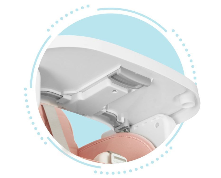A tálca állítható távolsággal rendelkezik a háttámlához képest, csak használja az alján található kart és mozgassa. Előnye a két rétegés a profilozott élekamelyek megakadályozzák, hogy az étel a földre essen.