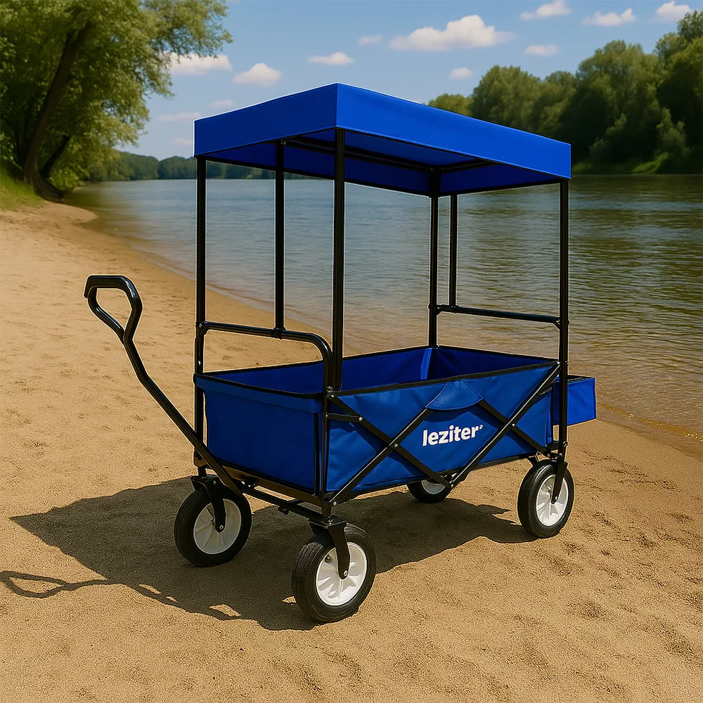 Anyag: A strandkocsi acél vázzal rendelkezik, ami rendkívül stabil és tartós. A kosara 600D poliészter szövetből készült, ami nemcsak erős és strapabíró, hanem könnyen tisztítható is. Az élénk kék szín pedig ízléses és figyelemfelkeltő megjelenést kölcsönöz a kocsinak.