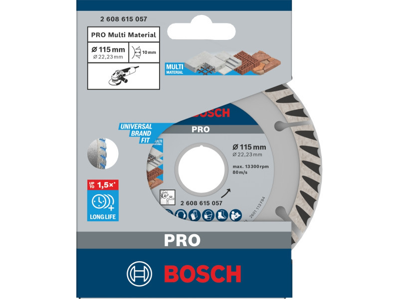 Akár 1,5x tovább bírja, mint a Bosch Eco for Universal vágótárcsaHosszú élettartam többféle építőanyag vágásakorKis súrlódású szegmensek a minimális oldalsó kopás érdekében22,23 mm-es furattal normál rögzítőanyás sarokcsiszolókhozPRO Multi Material különböző építőanyagok vágásához hosszú élettartammalAz építkezéseken dolgozó szakemberek számára nélkülözhetetlen az univerzális gyémánt vágótárcsa. A PRO Multi Material gyémánt vágótárcsát kellően erőssé tettük ahhoz, hogy bármilyen vágandó anyaggal megbirkózzon.A PRO Multi Material fejlett kialakítási jellemzői hosszabb élettartamot biztosítanak, mint a hagyományos gyémánt vágótárcsák. A kis súrlódású szegmensek minimalizálják a tárcsa oldalának kopását, és gyorsan elszívják a port a vágási területről, biztosítva a hosszú élettartamot.