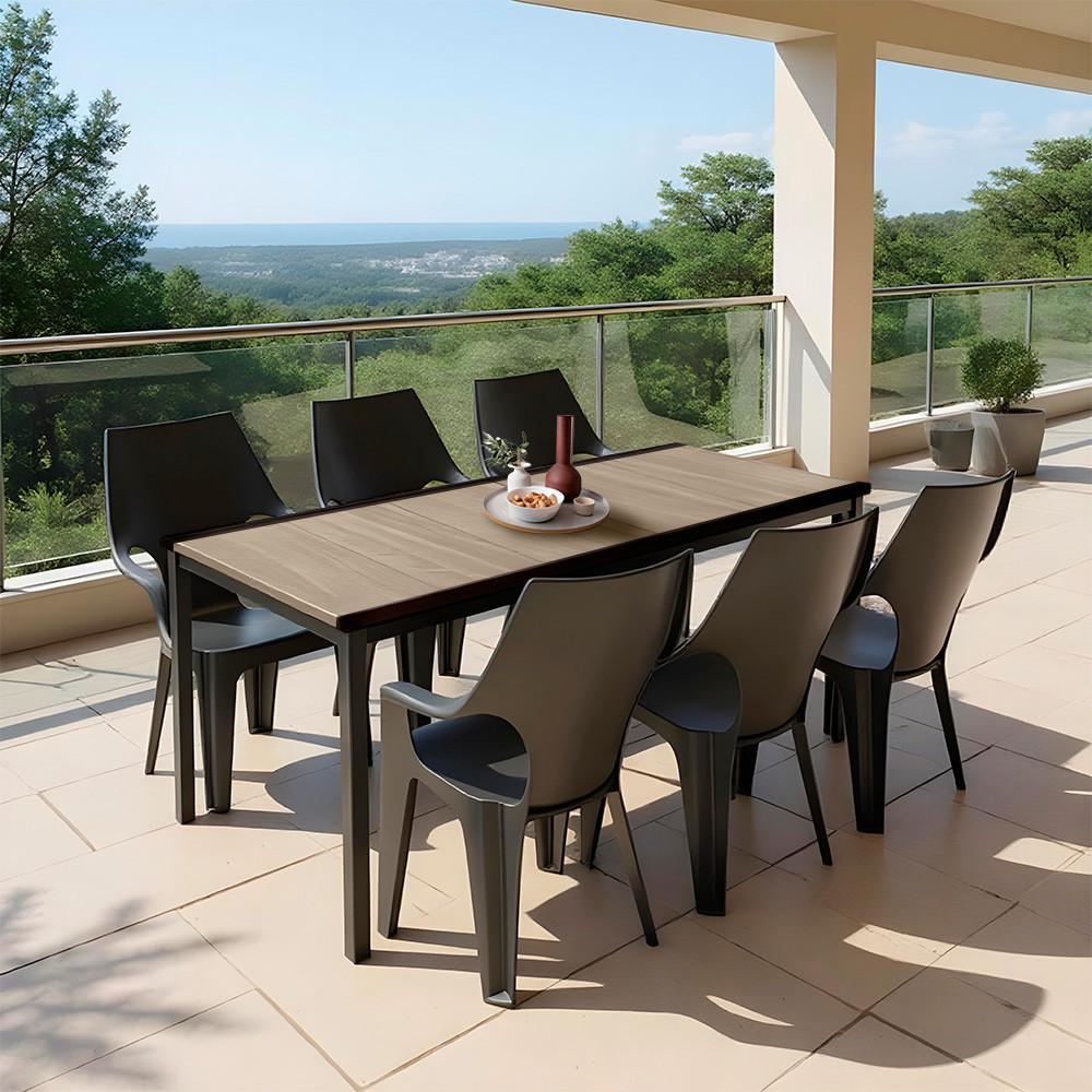 A jellegzetes, enyhén lekerekített magas háttámla és az áramvonalas kartámasz egész napos kényelmet biztosít. Ha épp nincs szükség mind a hat székre, pillanatok alatt egymásra pakolhatod őket – így egy kis erkélyen vagy tárolóban is könnyen elférnek. A teljesen műanyag váz korróziómentes, nincs festési vagy lakkozási igény, és bátran kint hagyhatod a tűző napon vagy egy záporban is.