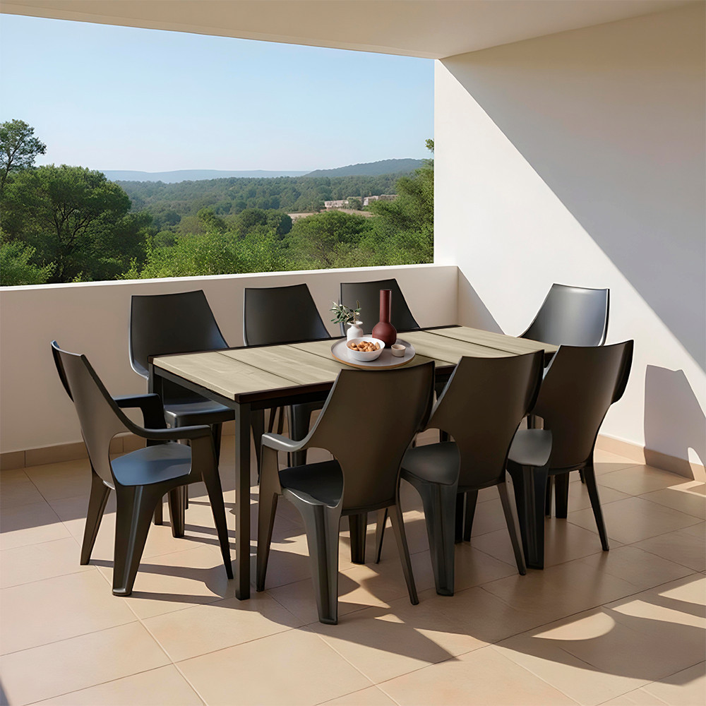 A jellegzetes, enyhén lekerekített magas háttámla és az áramvonalas kartámasz egész napos kényelmet biztosít. Ha épp nincs szükség mind a hat székre, pillanatok alatt egymásra pakolhatod őket – így egy kis erkélyen vagy tárolóban is könnyen elférnek. A teljesen műanyag váz korróziómentes, nincs festési vagy lakkozási igény, és bátran kint hagyhatod a tűző napon vagy egy záporban is.