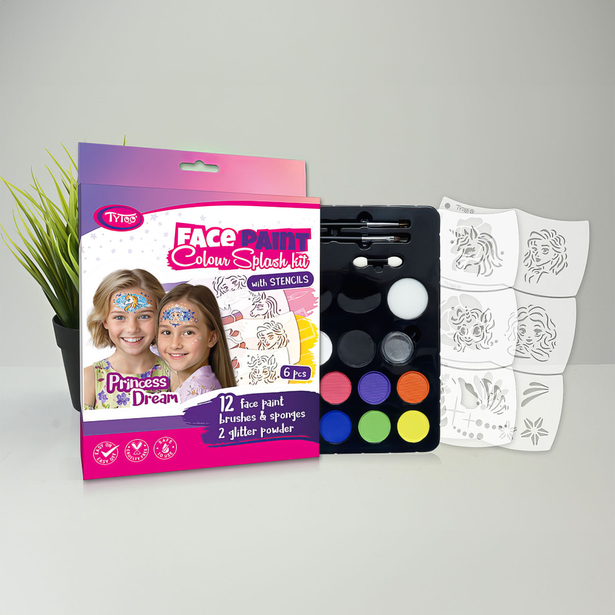 Hatalmas öröm a gyerekeknek egy arcfestés, amit most már rajztudás nélkül Ön is elkészíthet otthon. A TyToo Princess Dream arcfestő szettje a 12 féle szín mellett 6 db Mosaic sablont is tartalmaz. A sablon használata egyszerű és szórakoztató, a paletta pedig rengeteg színt tartalmaz, hogy igényeire formálhassa a mintákat.
