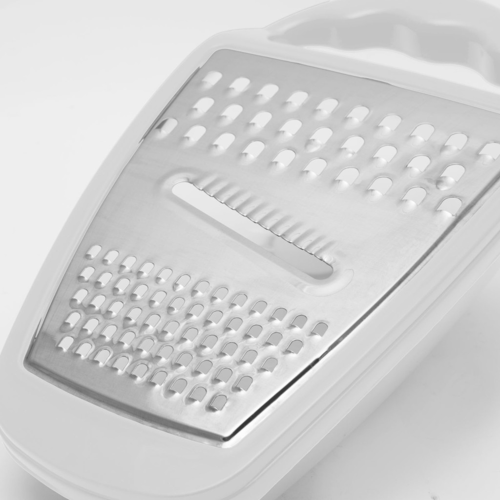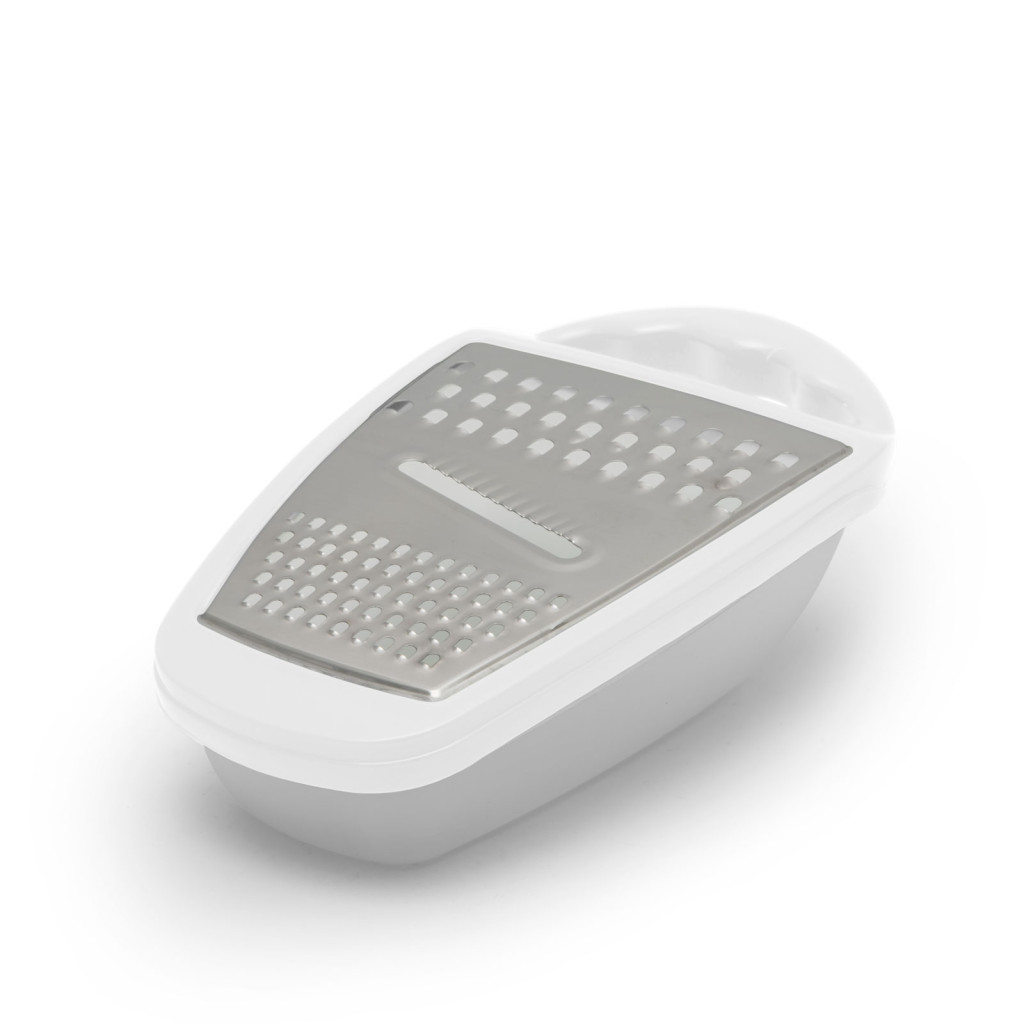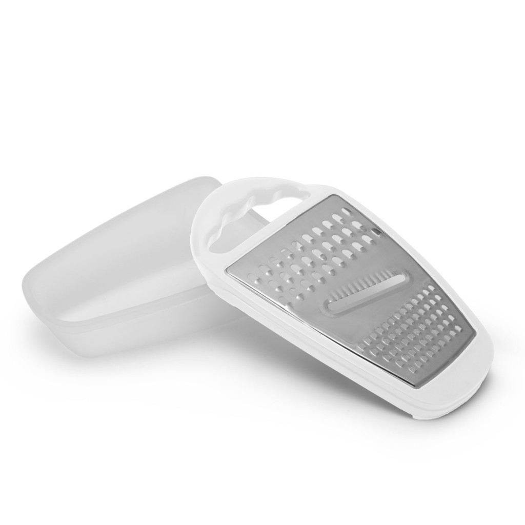Ez a tárolódobozzal egybeépített fém reszelő alkalmas lehet sajtok, uborka, alma, répa és különböző zöldségek reszelésére úgy, hogy a műanyag gyűjtőedényben landol az aprított alapanyag 100%-a. Ezáltal megakadályozható, hogy az szétszóródjon a konyhában. A fehér, műanyag fogantyú kialakítása stabil és kényelmes fogást biztosít, az éles aprítófelületnek köszönhetően könnyen és gyorsan reszelhetünk. A használat befejeztével csak pattintsuk le a műanyag fedelet.