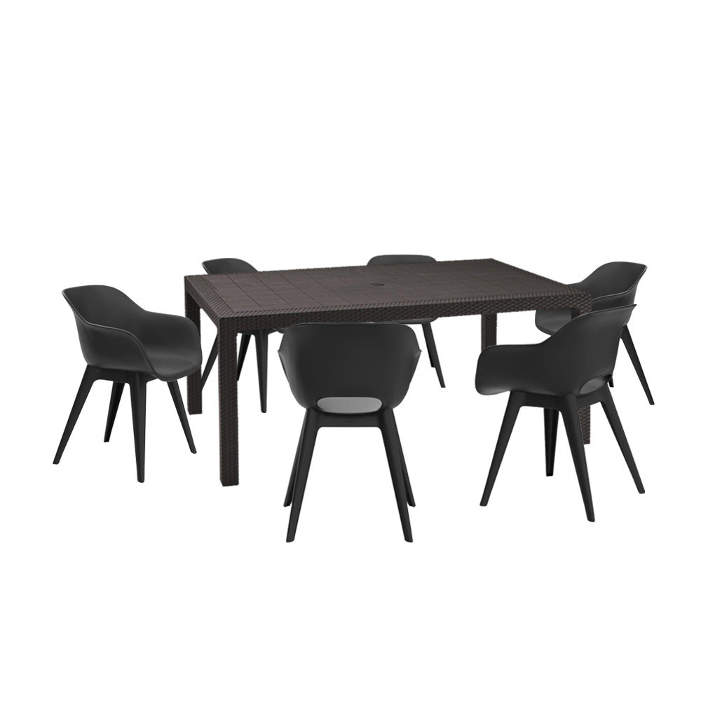 Ez a grafit színű, kényelmes és elegáns bútor szett hat darab 57X56X81 cm-es széket, és egy 160X95X75 cm-es asztalt foglal magában. Ez a 6 személyes kerti bútor szett rendkívül előnyös lehet, ha szeretnéd kiélvezni a szabadban eltöltött időt barátaiddal vagy családoddal. Ideális elemként szolgál a kert, erkély vagy terasz díszítéséhez. Különleges formája és minimalista megjelenése teszi univerzálissá és bármilyen elrendezéshez alkalmazkodik. A szett praktikus megoldás, egész évben a szabadban maradhat, hisz magas a tűröképessége és ellenáll a szélsőséges időjárásoknak.