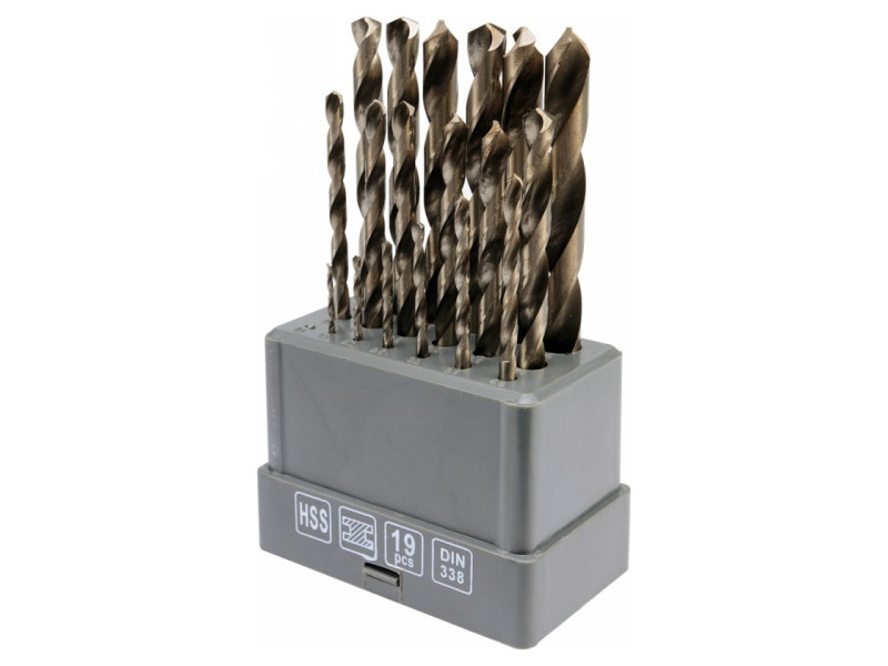 Gyorsacélból készült fúrók. Alkalmazott felület és fúróél. 135 fokos szög. Keresztvágás lehetővé teszi a fúrás indítását előjelölés nélkül. Kivitelezés a DIN 338 szerint. Professzionális alkalmazásokra szánva. Praktikus műanyag kazettában. A készlet 19 fúróból áll, [mm] átmérővel: 1.0; 1.5; 2.0; 2.5; 3.0; 3.5; 4.0; 4.5; 5.0; 5.5; 6.0; 6.5; 7.0; 7.5; 8.0; 8.5; 9.0; 9.5; 10.0