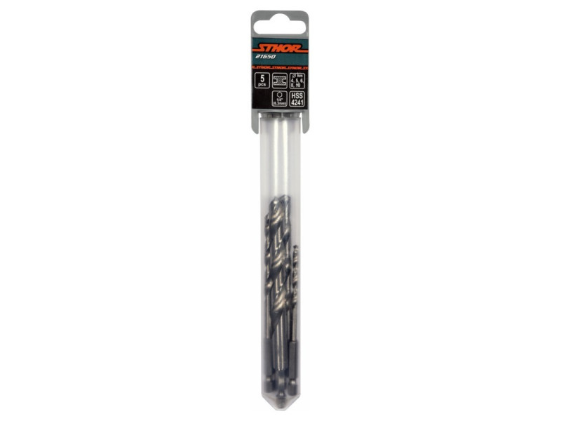 Egy STHOR 21650 hatszögletű nyéllel rendelkező fémfúró készlet. HSS gyorsacélból készült. A Split Point lehetővé teszi a fúrást előzetes jelölés nélkül. Drot fúróélek. 135 fokos szög.