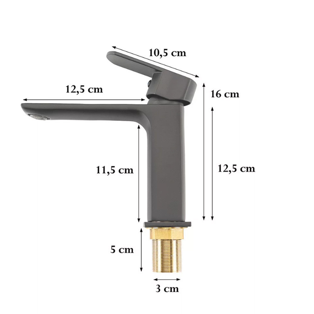 • Méretek: teljes magasság 16 cm, kifolyó magasság 12,5 cm, kifolyó hossza 12,5 cm, fogantyú hossza 10,5 cm, talpátmérő 3 cm, menetes rész hossza 5 cm