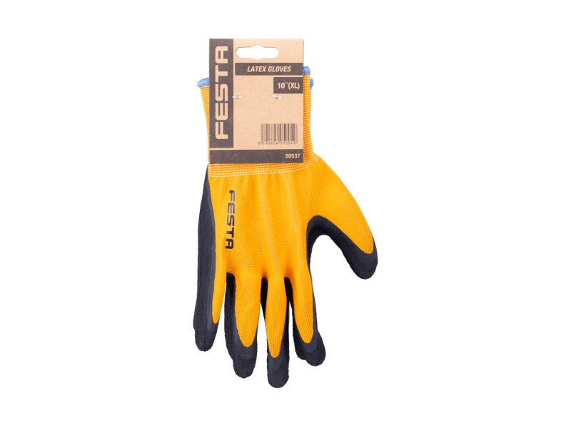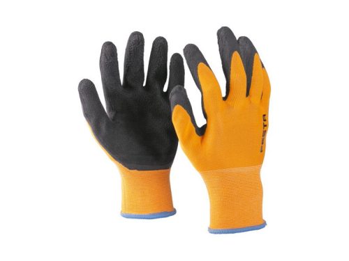 Narancssárga kötött puha nejlonból, tenyérrel fekete latex habszivacsba mártva, CE EN 388, 10-es méret.