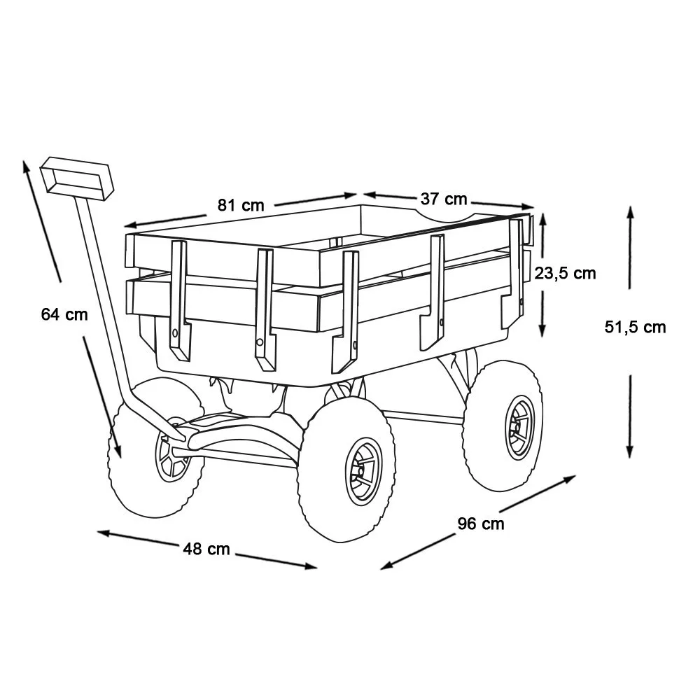 A strapabíró fém váz 150 kg teherbírással bír, így nagyobb súlyok szállítására is alkalmas. A fa oldalfalak fix rögzítéssel rendelkeznek, biztonságosan tartva a rakományt minden helyzetben.